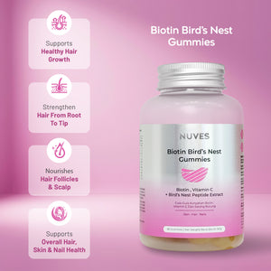NUVES Biotin Birdâs Nest Gummies are formulated to support healthy hair, glowing skin, and strong nails in a convenient and enjoyable daily gummy.